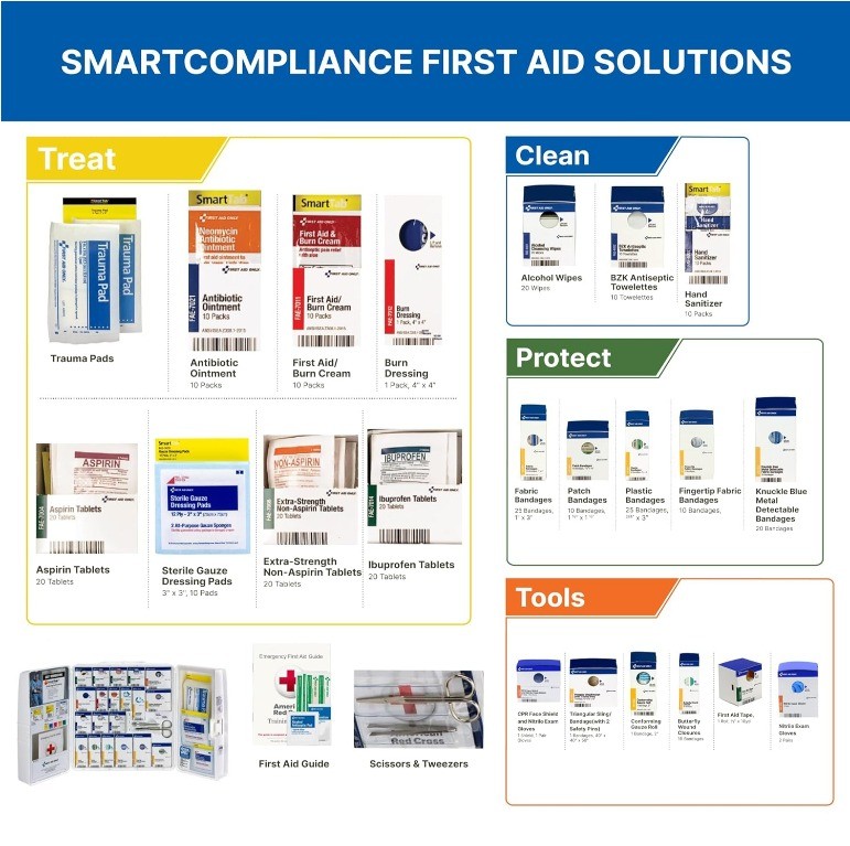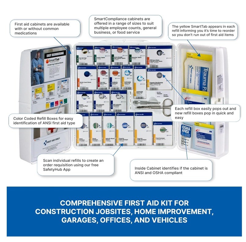 • SmartTab System: Our SmartTab ezRefill System makes it quick, easy and cost-effective to reorder and restock this industrial first aid kit with first aid kit refill supplies