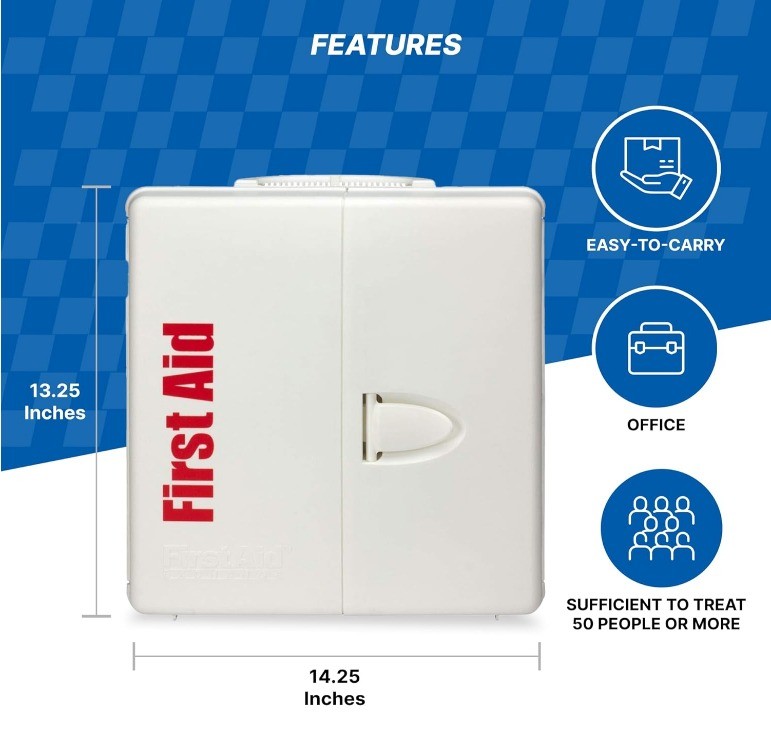 • OSHA-Compliant Emergency Kit: Ideal for industrial facilities and large corporate offices, this emergency first aid kit includes 245 pieces sufficient for treating 50 or more people, including over-the-counter medications